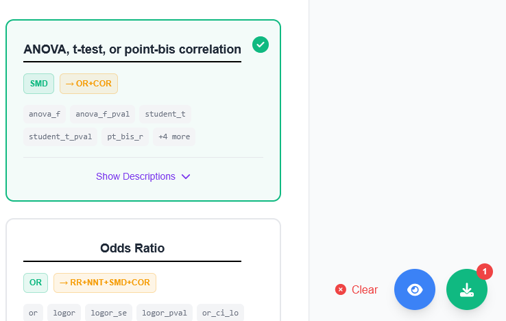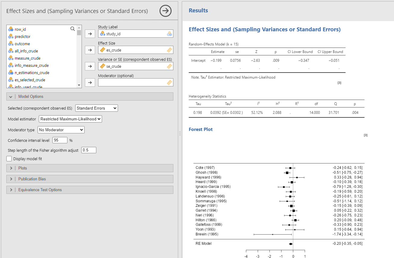 En exportant le tableau de données produit par metaConvert, il est possible de l'exploiter sous Jamovi en passant par le package MAJOR. Ce package contient notamment l'analyse "Effect Sizes and (Sampling Variance or Standard Errors)". Ce taitement se base notamment sur la taille d'effet (Effect Size), variable es_crude calculée par metaConvert, et, l'écart-type/variance (Standard Error/Variance), variable se_crude calculée par metaConvert. Vous pouvez ainsi réaliser des "forest plots", graphiques très communs pour les méta-analyses. forest plot - MAJOR - Jamovi